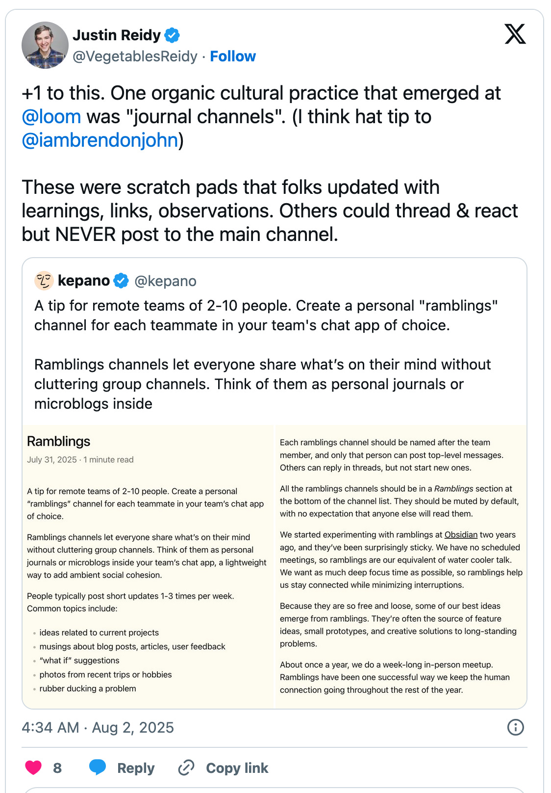 I havenβt been using X/Twitter, but I signed on today and saw my friend Justin (Veggies) had tweeted about the practice journal channels on Slack. The timingβs uncanny, because I had just started putting this blog together.
